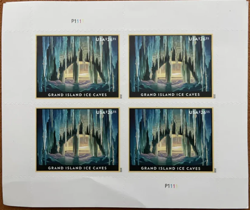 On January 18, 2020, in Munising, MI, the United States Postal Service? will issue the $26.35 Grand Island Ice Caves Priority Mail Express? stamp in one design, in a pressure-sensitive adhesive (PSA) pane of four stamps (Item 129100). The stamp will go on sale nationwide January 18, 2020, and must not be sold or canceled before the first-day-of-issue.