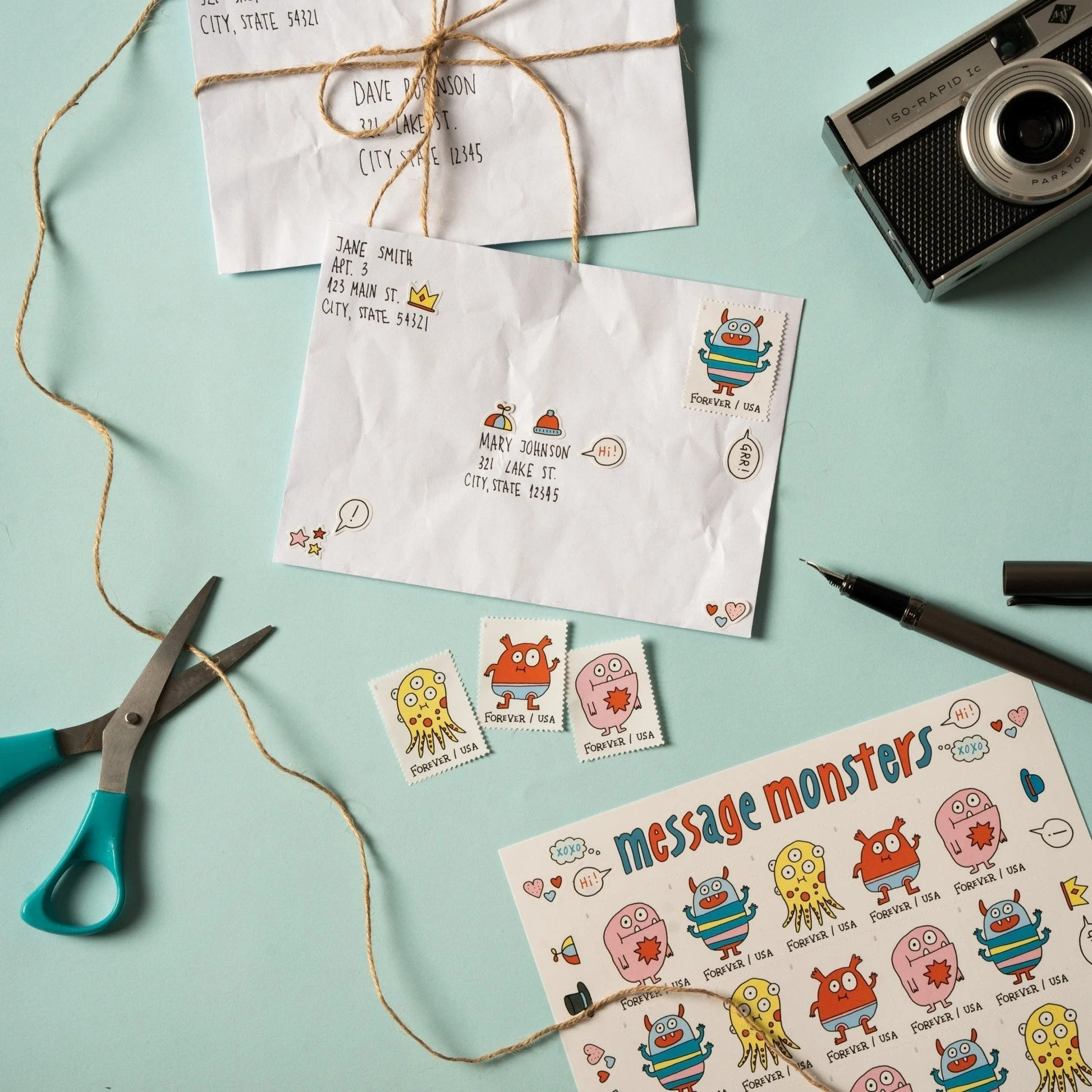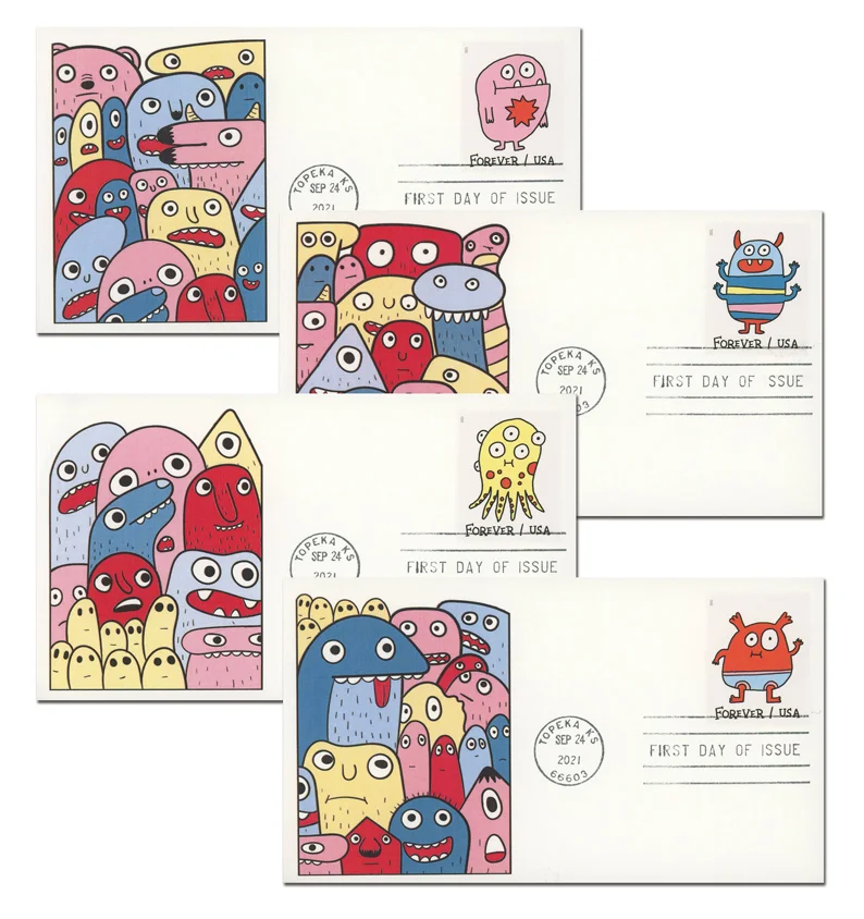 In 2021, the USPS introduced a set of four Message Monsters Stamps with the aim of sparking interest in young people. The Stamps were a collaborative effort between USPS art director Antonio Alcal?? and renowned children’s author and illustrator Elise Gravel.